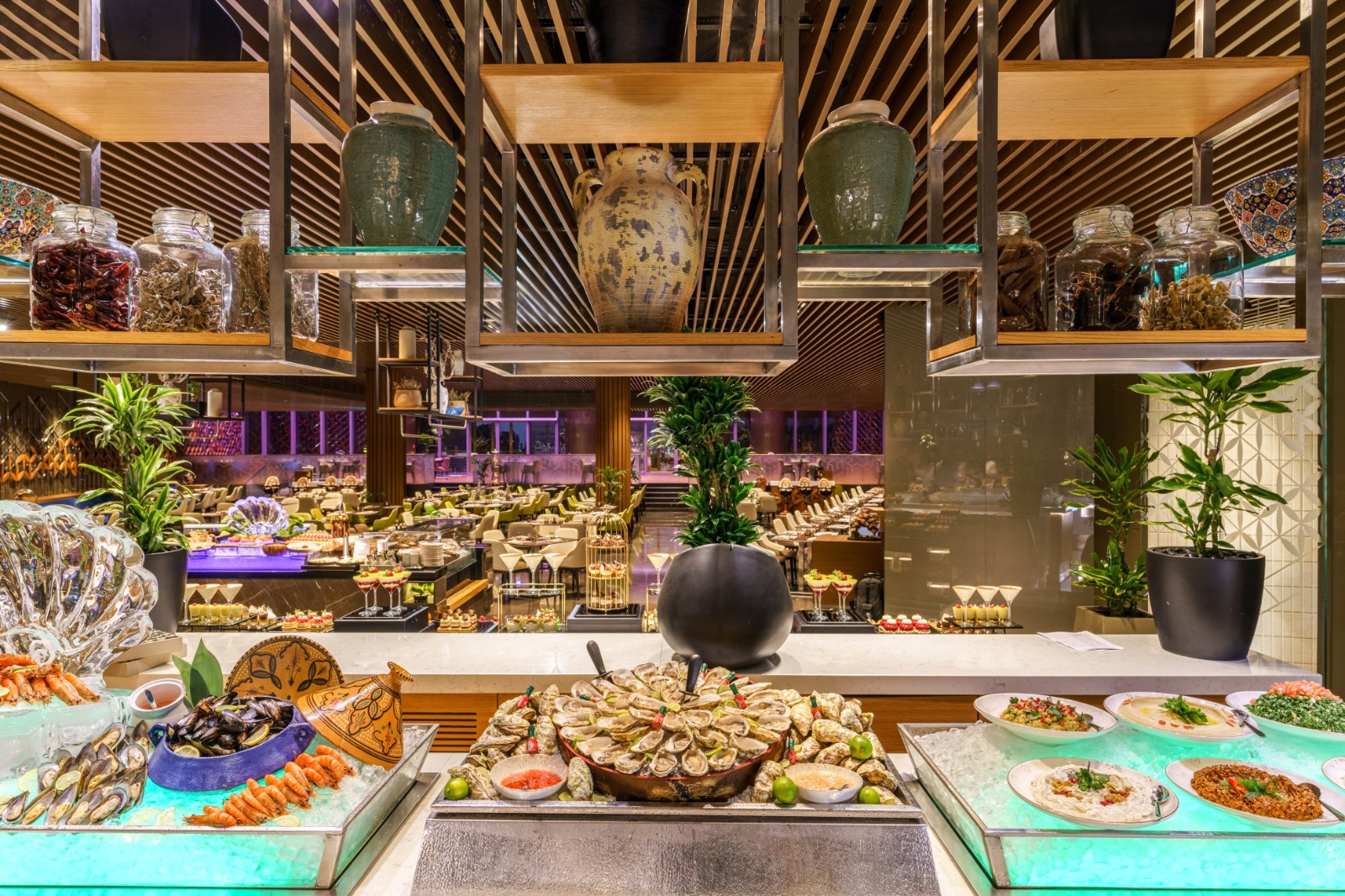 يقدّم المكان مغامرة طهي عالمية تبدأ مع مجموعة مختارة بعناية من المقبلات الطازجة، والخبز، والسلطات، والأجبان الفاخرة، كما يمكن لعشاق السوشي تجربته مباشرةً من محطة السوشي الحيّة لتذوق نكهات المطبخ الياباني الأصيلة والمحضّرة بمهارة عالية. أما الأطباق الرئيسية فتحتضن تشكيلةً غنية تضم اللحوم المشوية بإتقان على النار المفتوحة، وأطباق الباستا الشهية. ويمكن للضيوف تجربة أطباق ترقى لأذواقهم المختلفة في محطة المأكولات البحرية، بالإضافة إلى تشكيلة من أطباق الكاري المتبّلة ومجموعة واسعة من المأكولات العالمية التي تلبي كافة الأذواق.