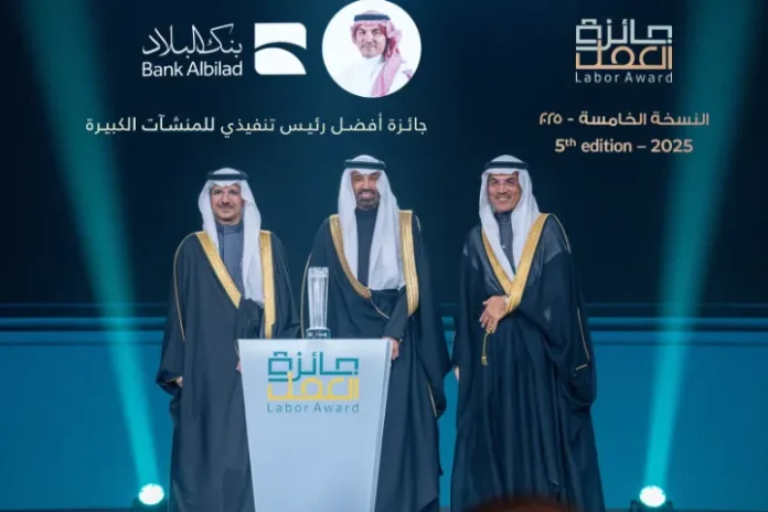 كرّم معالي المهندس أحمد بن سليمان الراجحي وزير الموارد البشرية والتنمية الاجتماعية الأستاذ عبدالعزيز العنيزان الرئيس التنفيذي لبنك البلاد بجائزة أفضل رئيس تنفيذي للمنشآت الكبيرة وذلك تقديرًا لدوره القيادي في تعزيز كفاءة الأداء المؤسسي، وتطوير بيئة العمل، وتمكين الكفاءات الوطنية.